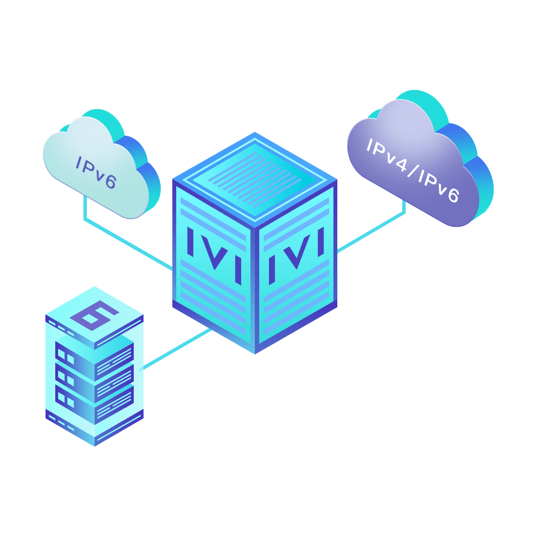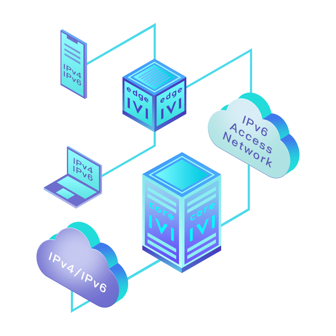 對正在進行IPv6整體升級規(guī)劃的運營商,應用IPv6升級方案2.5,通過IVI無狀態(tài)翻譯技術(shù)和純IPv6接入網(wǎng)絡,為雙??蛻舳撕碗p棧服務器提供連通服務。
